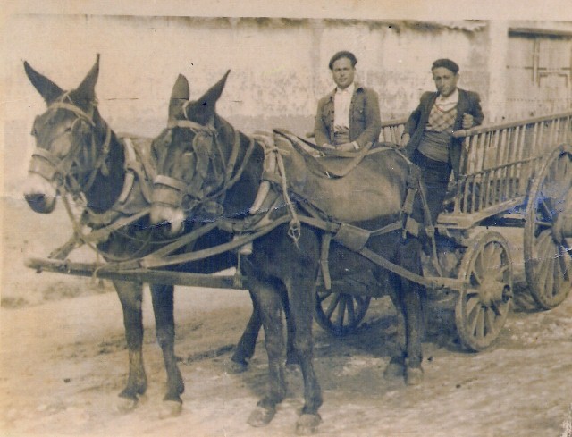 LA YUNTA DE MULAS Y LA GALERA EN PRIMER PLANO HACEN DE ESTA FOTOGRAFÍA UNA DE LAS MÁS BONITAS DE LA COLECCIÓN. EN LA FOTO, HILARIO MEJÍAS Y APOLONIO ARQUERO, AÑOS 50.