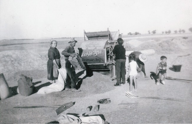 ESTA FOTOGRAFÍA REPRESENTA LAS FAENAS EN LA ERA, DONDE TODA LA FAMILIA AYUDABA EN LO QUE PODÍA EN LA LIMPIEZA DEL GRANO. EN ESTE CASO, SE ESTÁ AVENTANDO EL TRIGO CON UNA MÁQUINA QUE SE PONÍA EN MARCHA CON UNA MANIVELA, O CON LA MANO. |